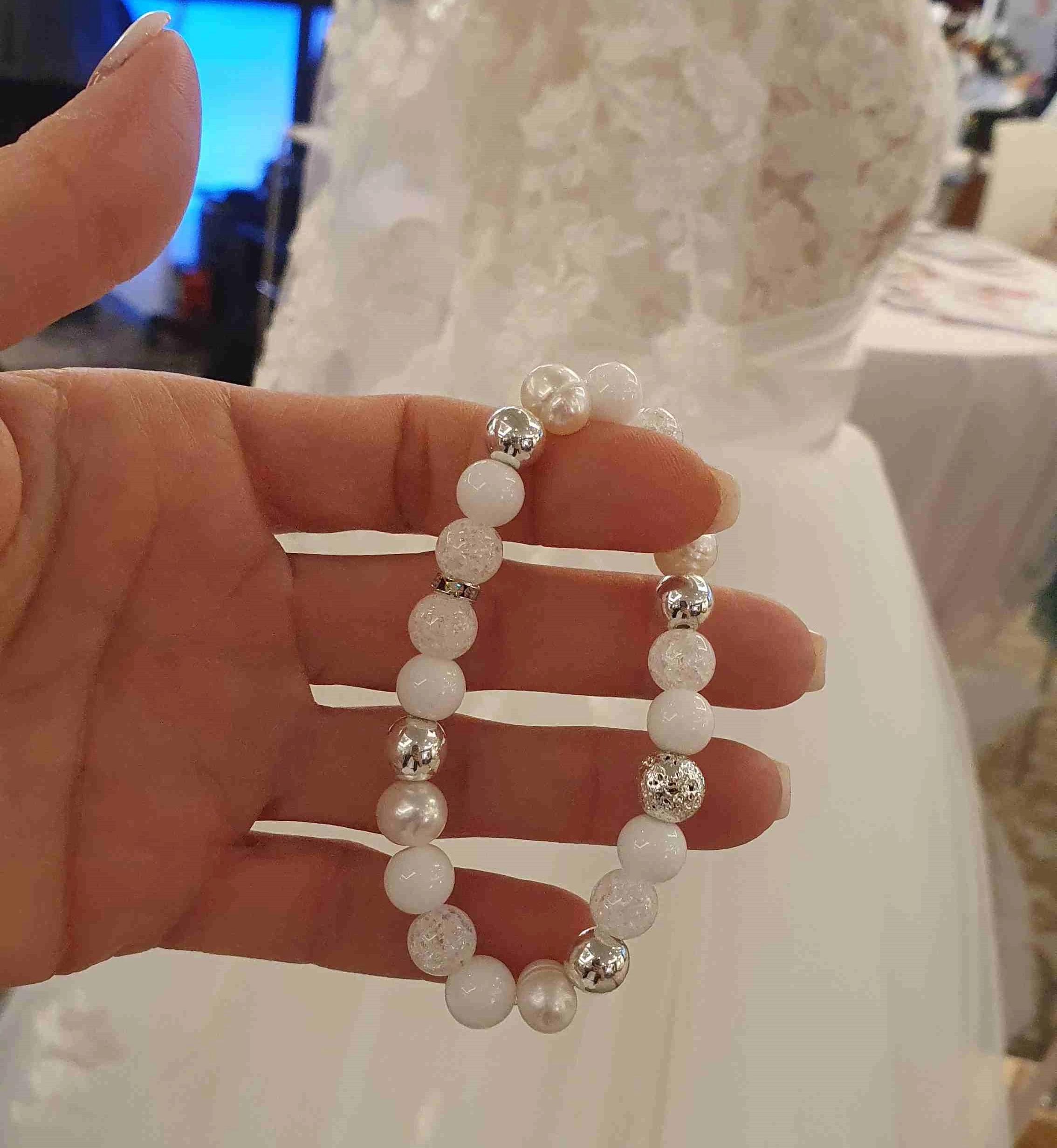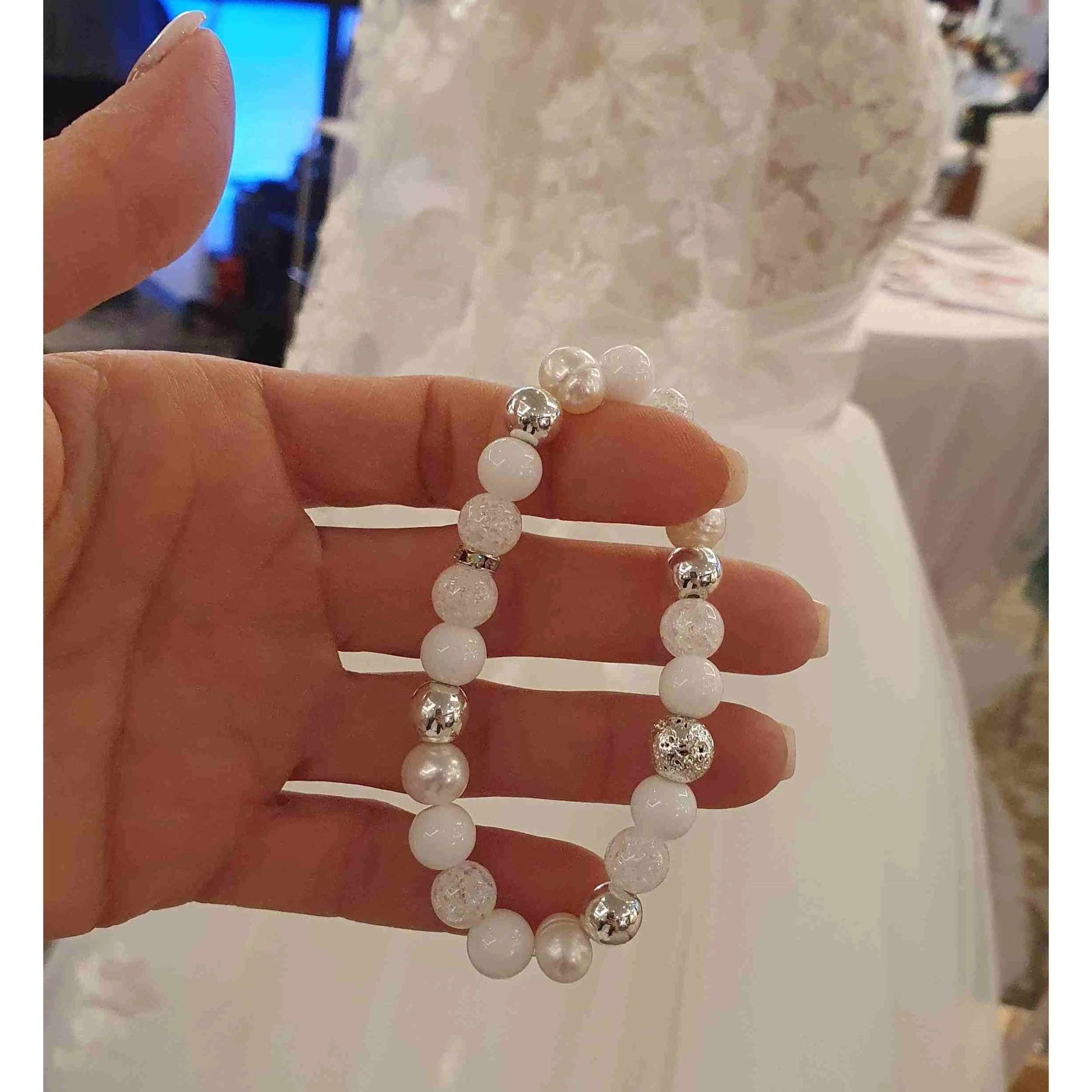 A karkötő egyedi készítésű, mely 8mm-es tejkvarc, tenyésztet igazgyöngy, roppantott hegyikristály, ezüst hematit és ezüst lávakő ásványgyöngyökből készült.
