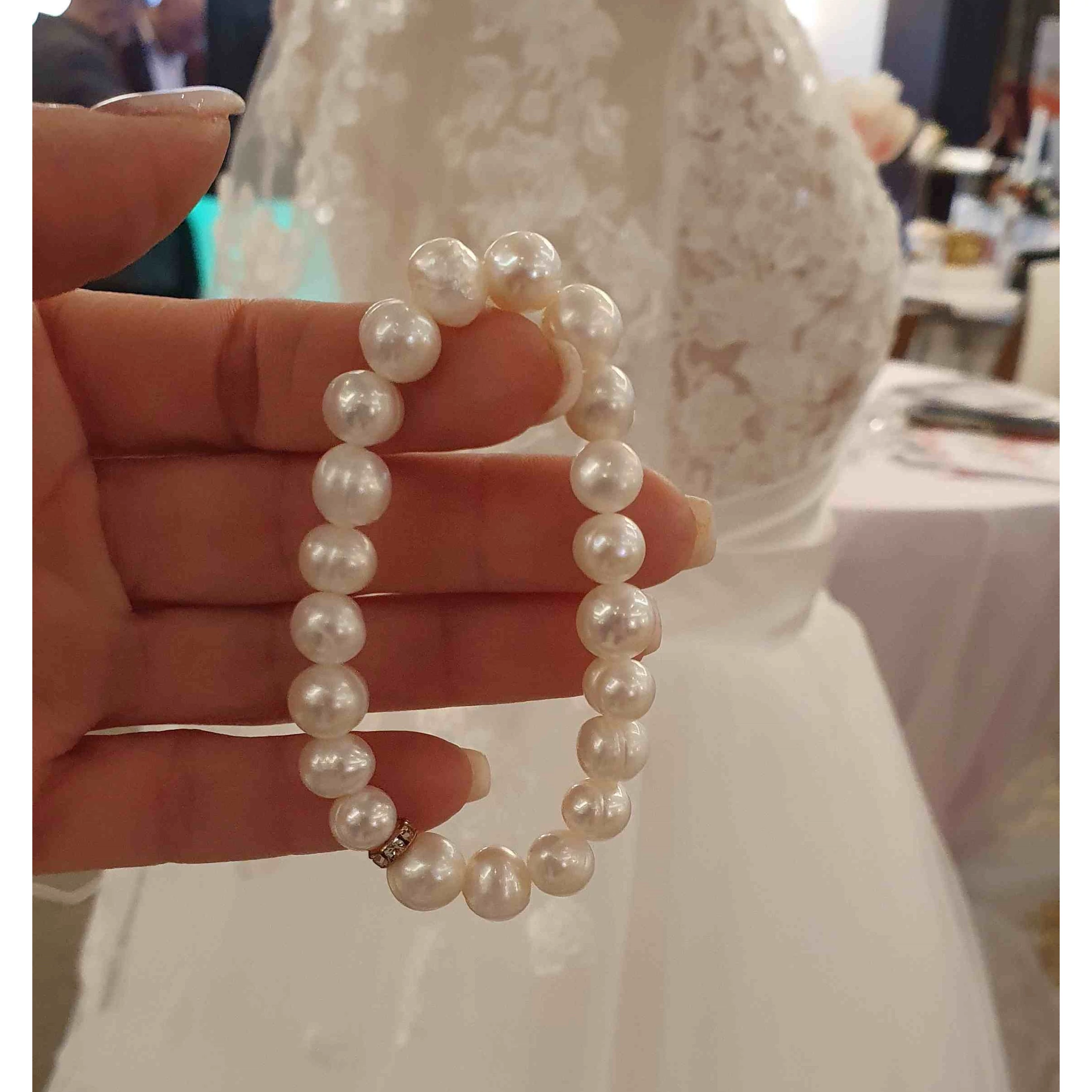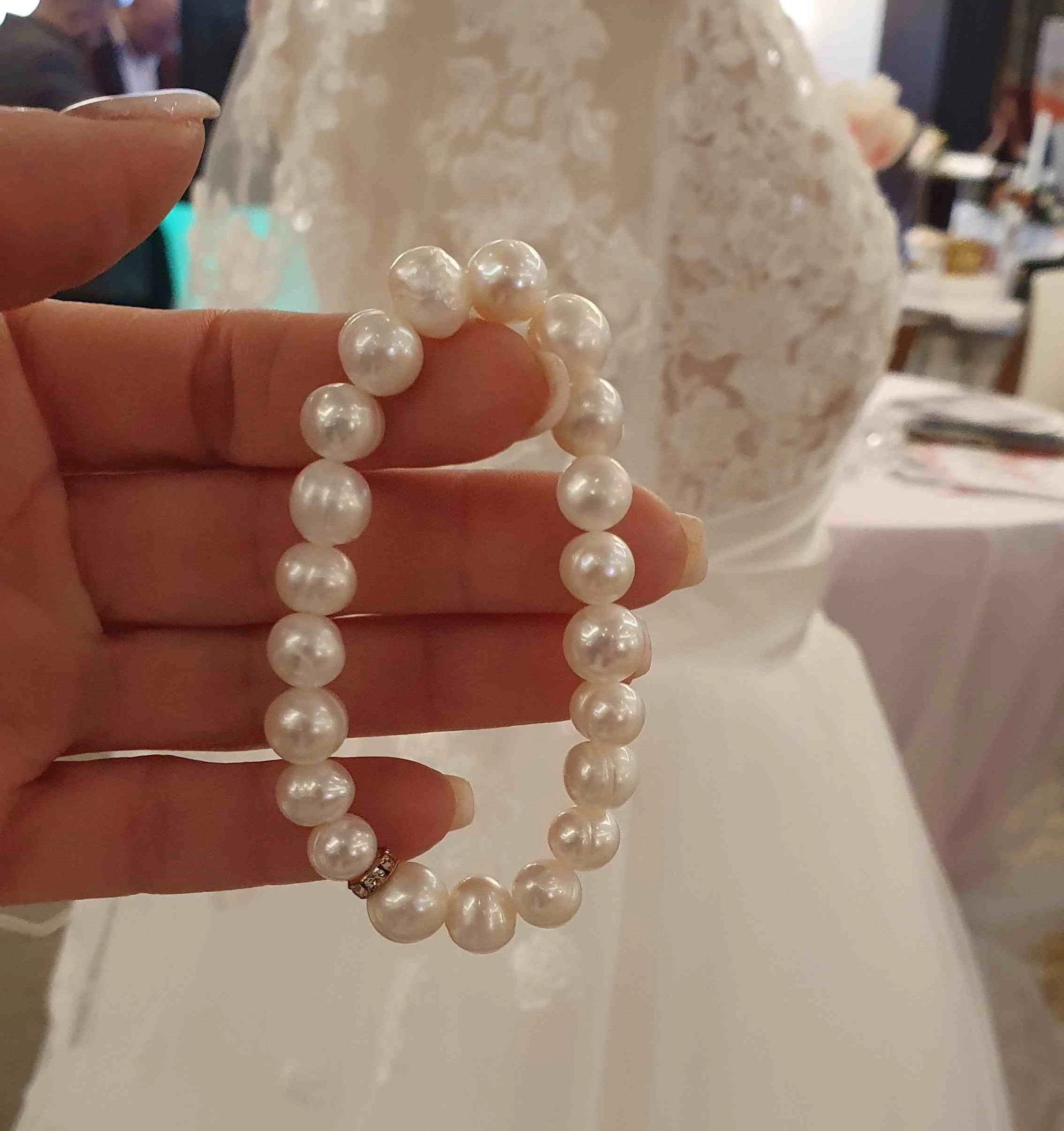 A karkötő egyedi készítésű, mely 8 mm-es tenyésztett igazgyöngy ásványokból készült.