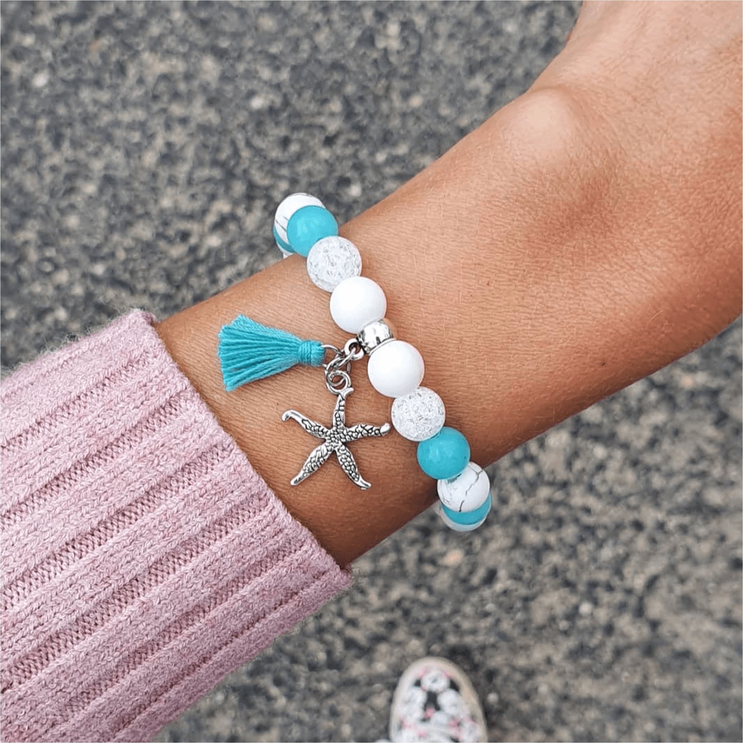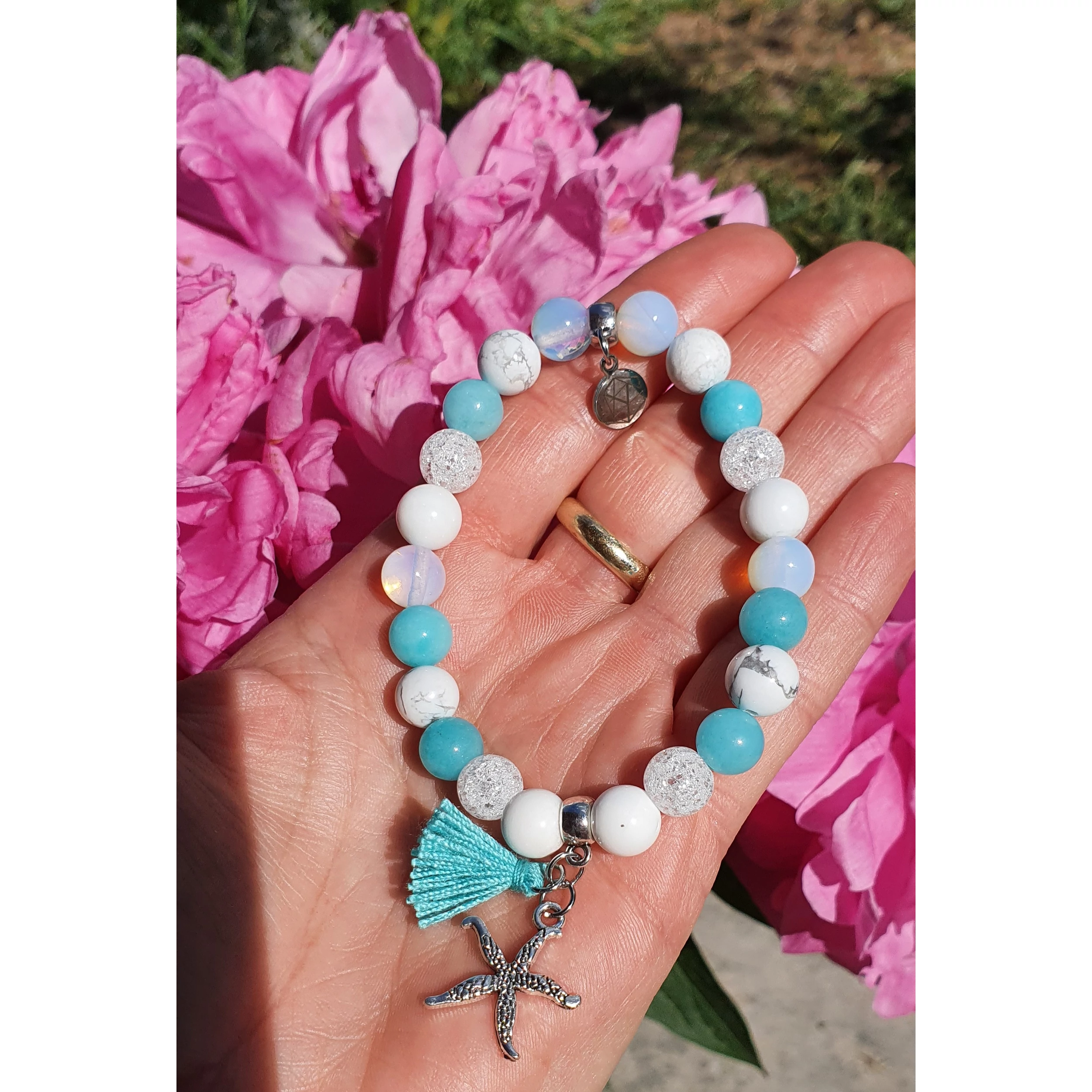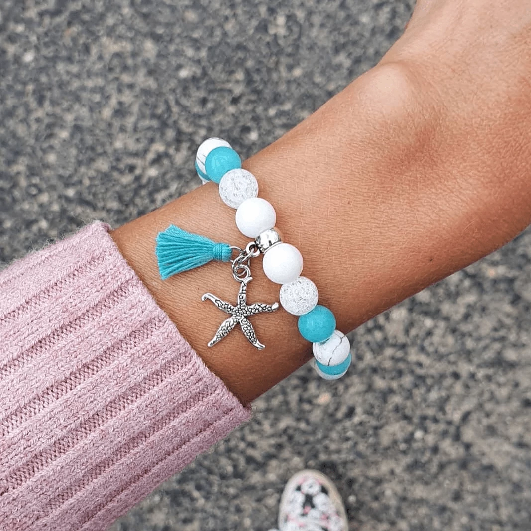 Álomszép "Türkiz álom" tengericsillagos ásványkarkötő, bojt medállal.