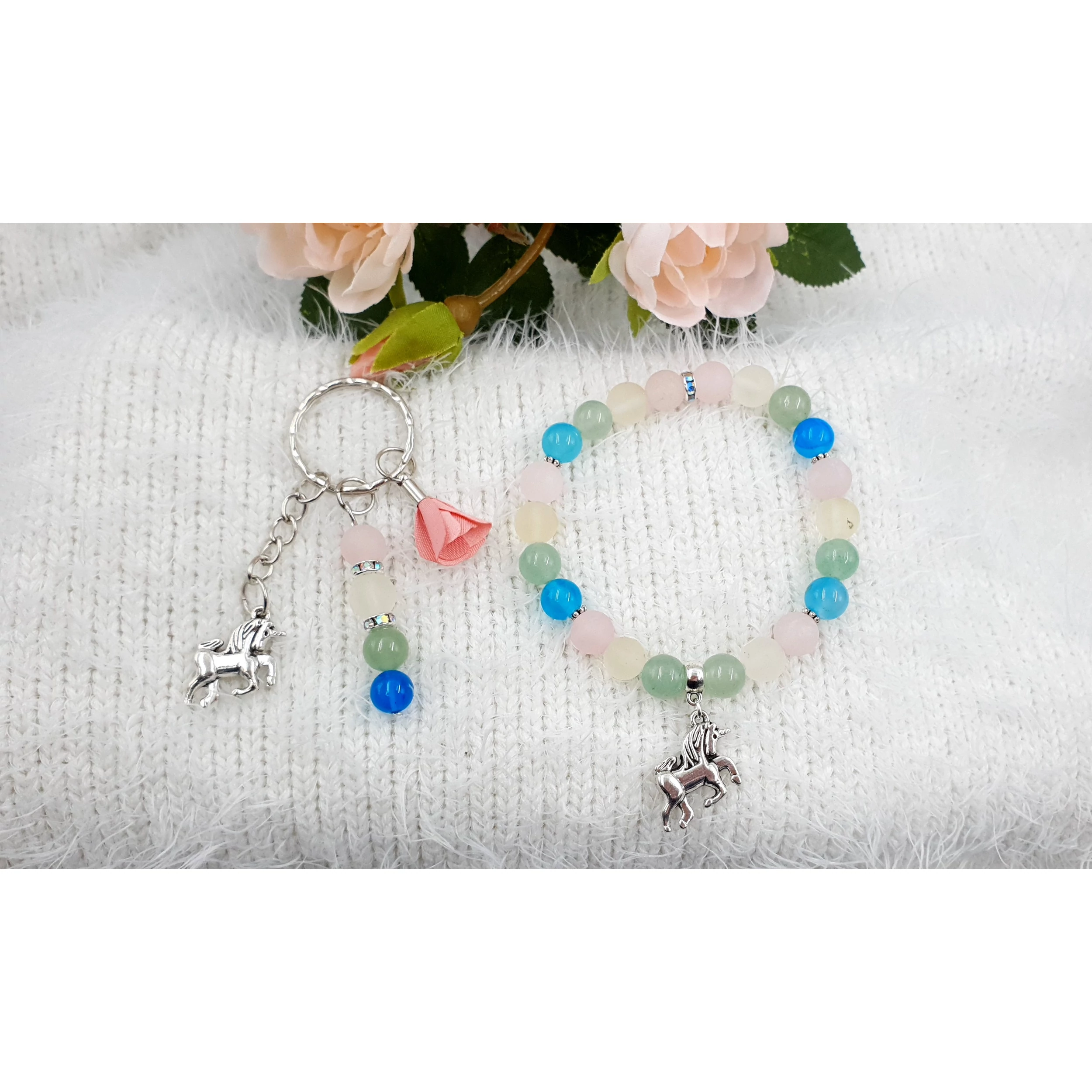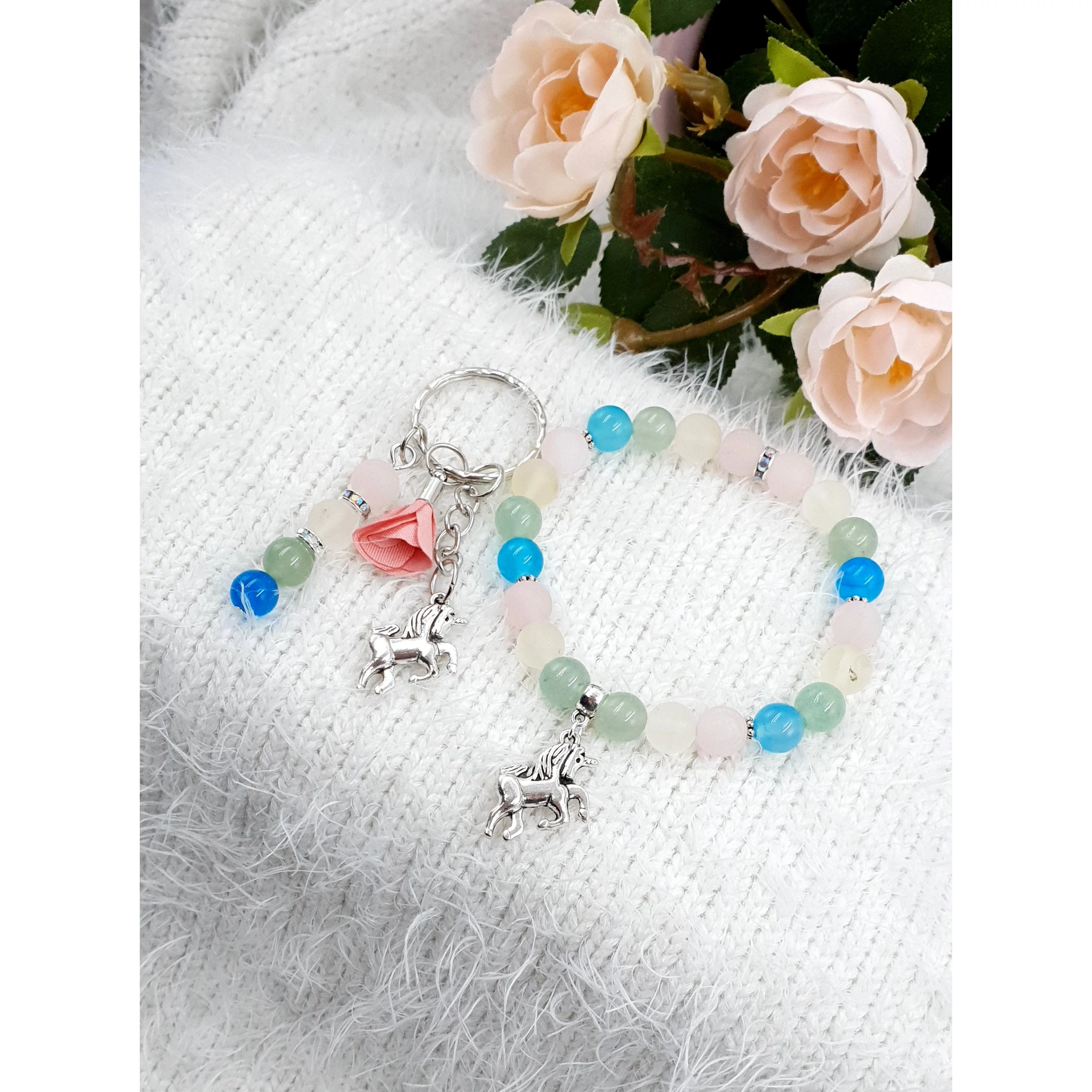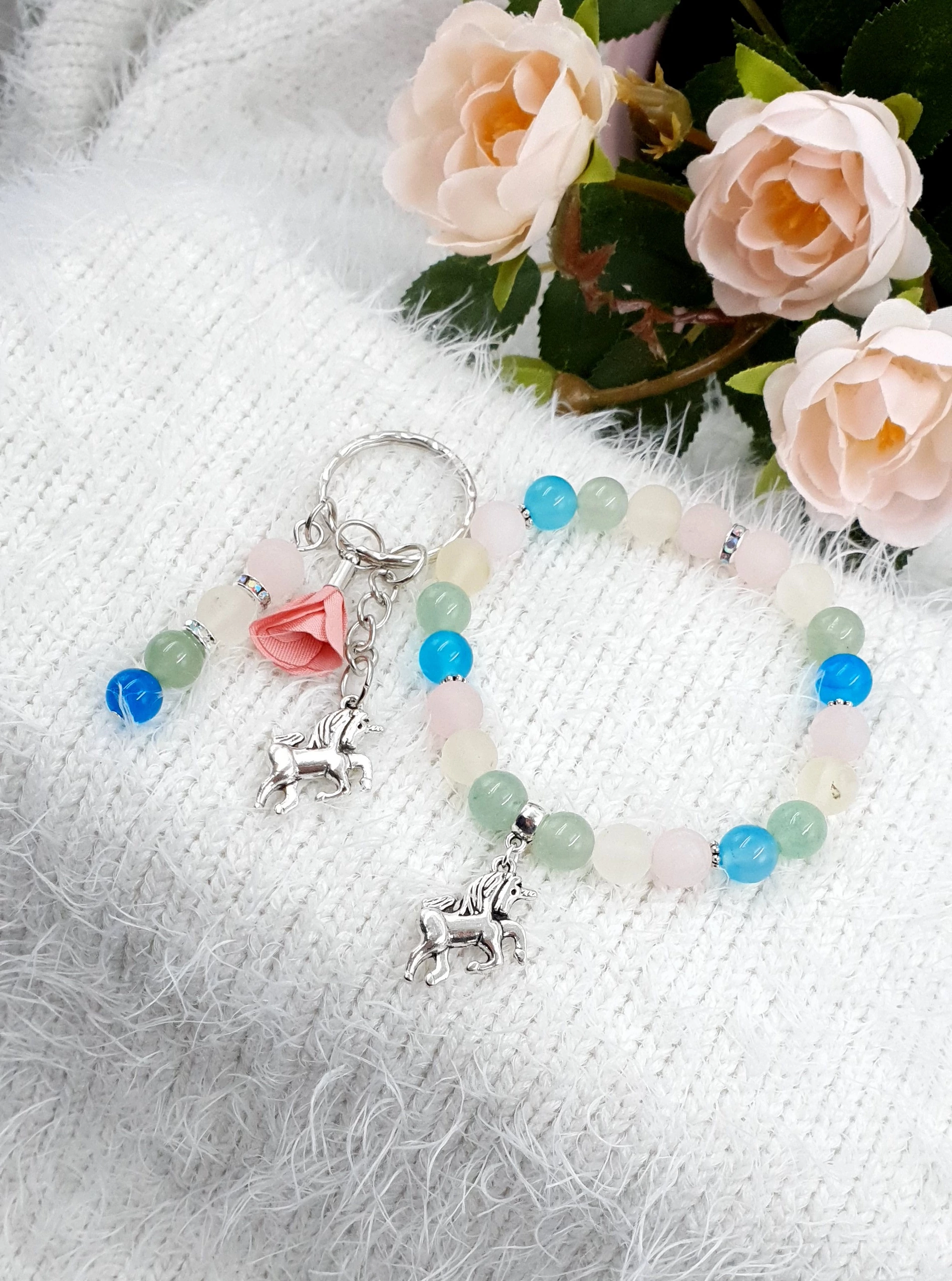 Ékszerszett, mely egy ásványkarkötőből és egy kulcstartóból áll.