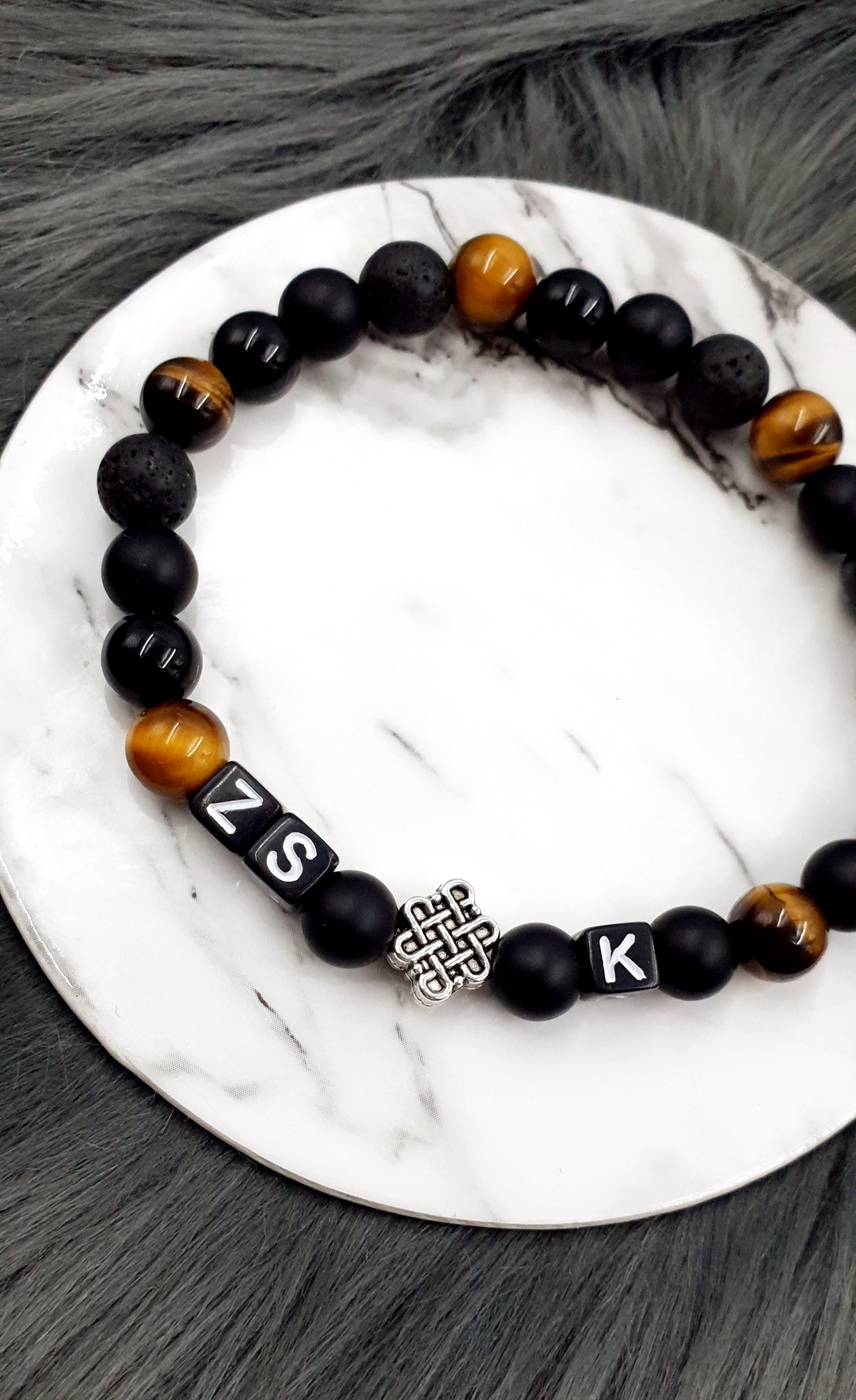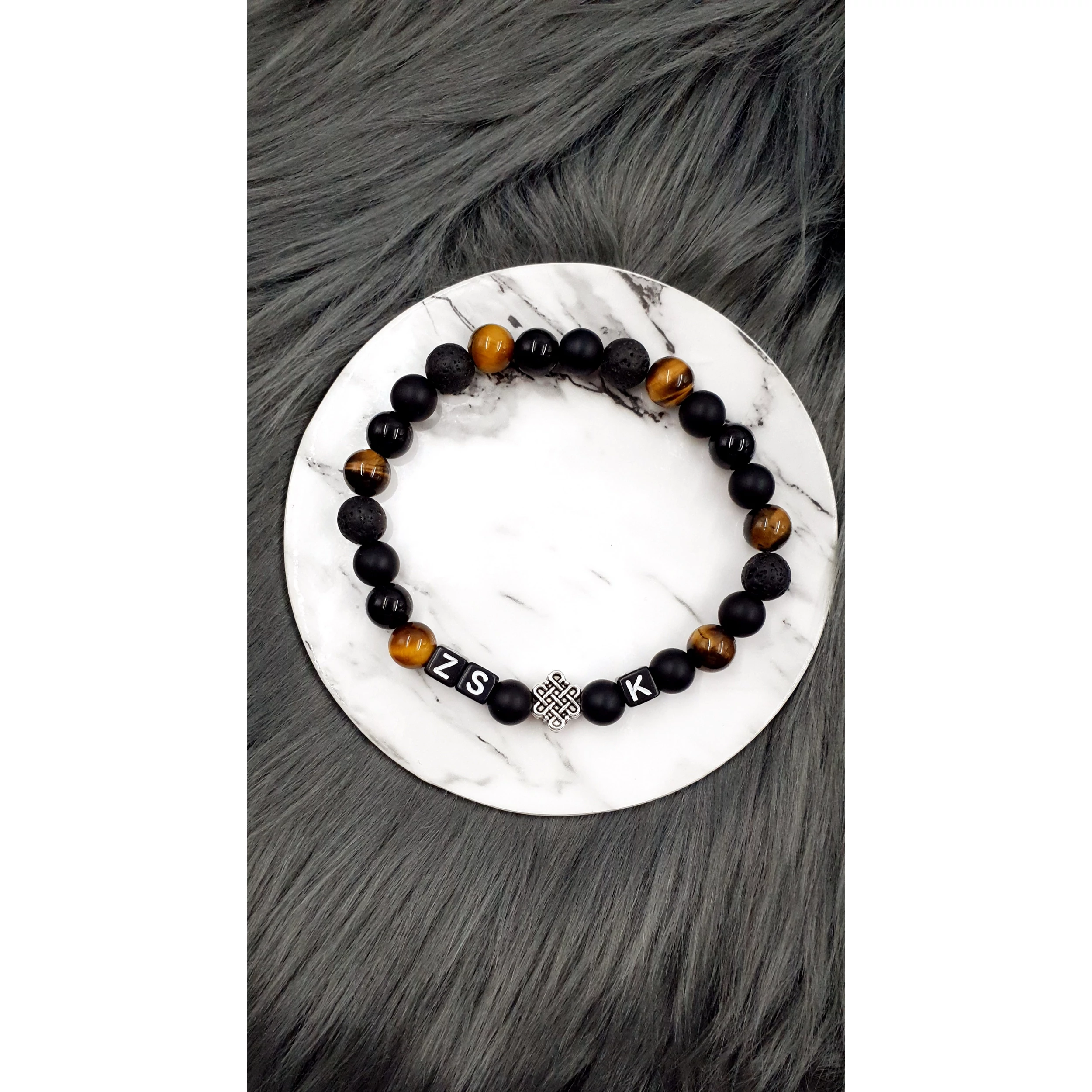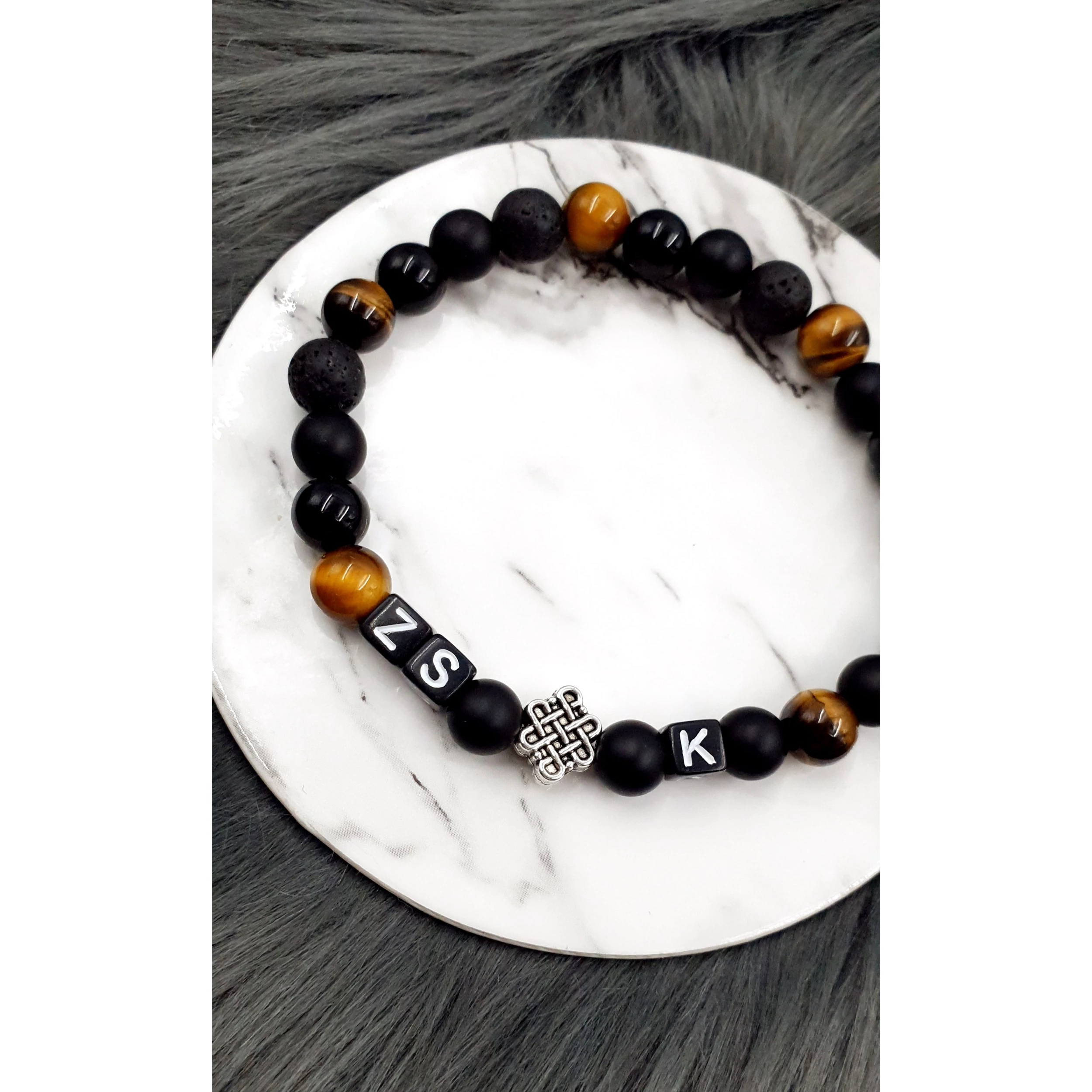 Végtelen fonat ásványkarkötő betűkkel. Ez egy gyönyörű egyedi ásványkarkötő, mely 8 mm matt ónix és tigrisszem ásványokból készült és egy apró végtelen fonat medált tartalmaz, mely az összetartozást szimbolizálja. A betűket egyedileg rendelheted hozzá. Megadhatod a gyermekek vagy családtagok monogramját vagy a párok a saját monogramjukat is. Megrendelhető női vagy férfi stílusban illetve párban is