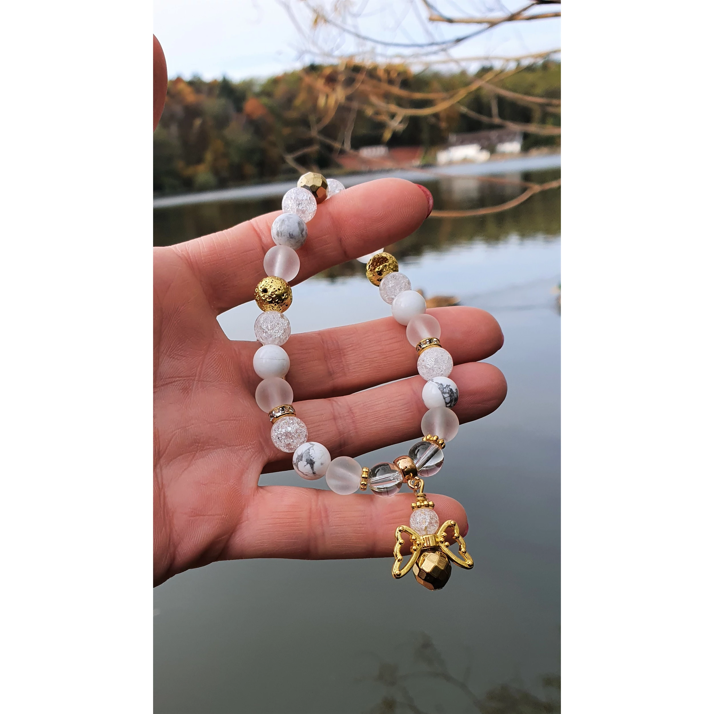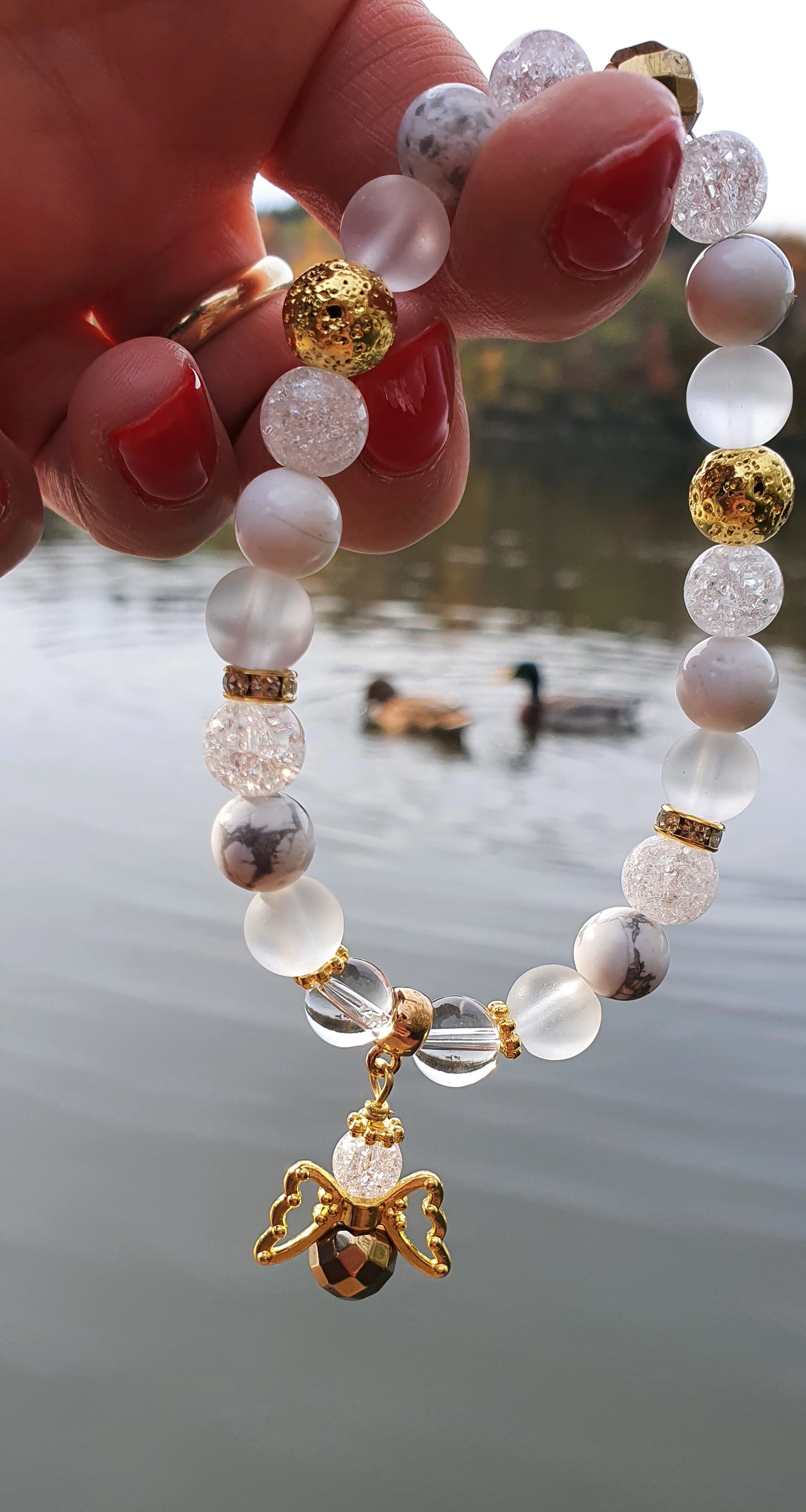Aura hegyikristály, hegyikristály, arany hematit, és arany lávakő ásványokból készült karkötő, arany szín díszítéssel és egy angyal medállal.