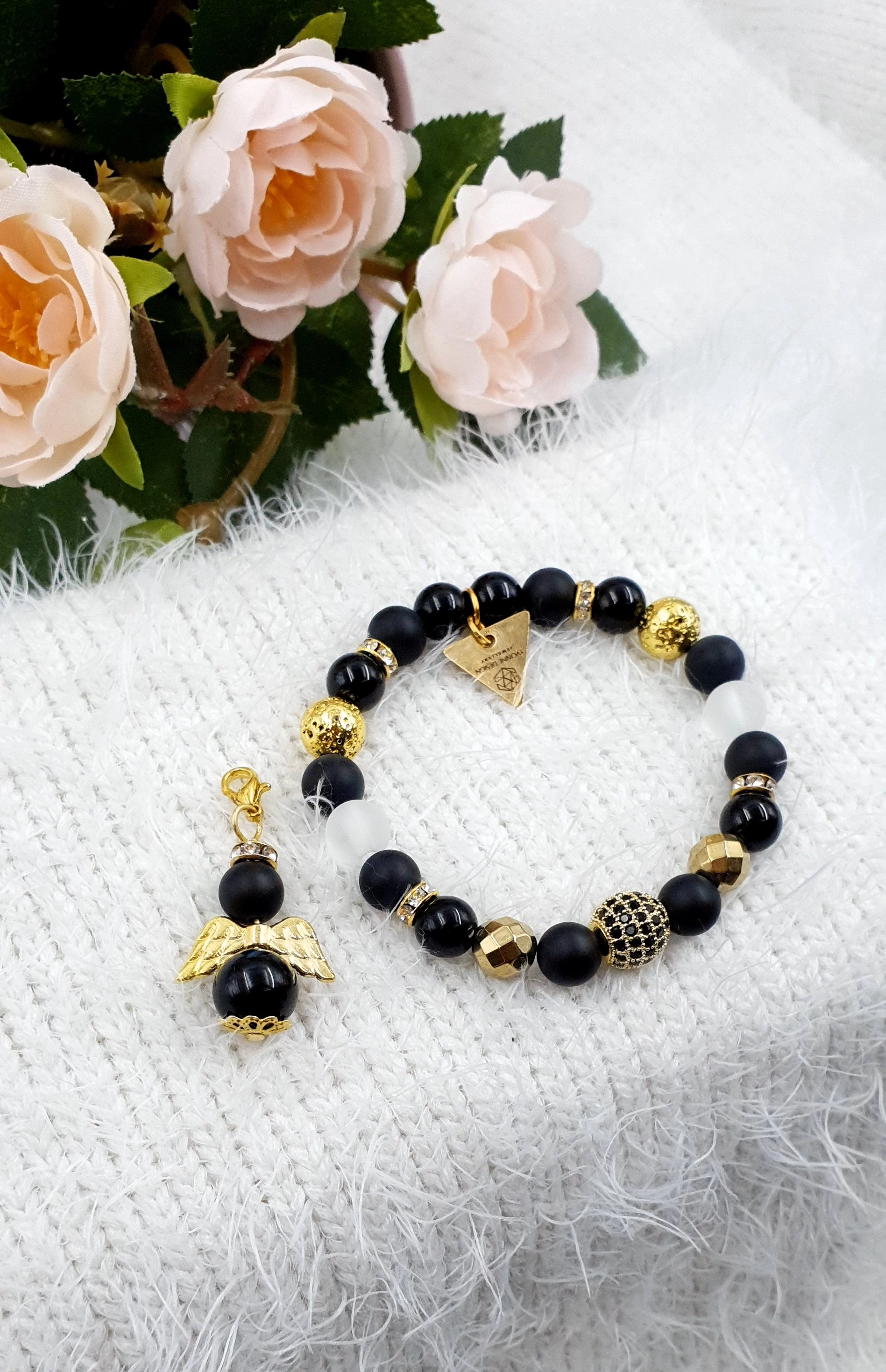 Matt  ónix, fényes ónix és matt hegyikristály ásványokból készült karkötő, arany szín díszítéssel és egy LUXURY cirkon gömb medállal.