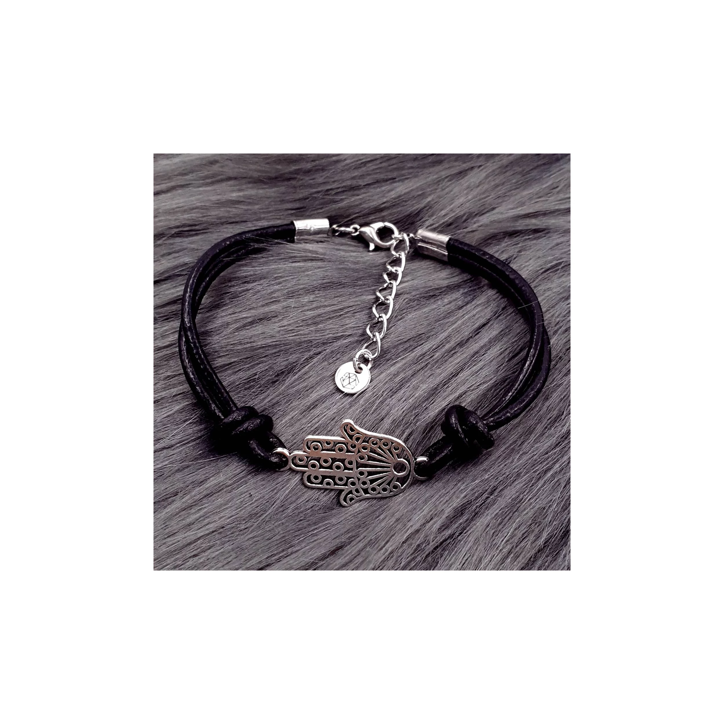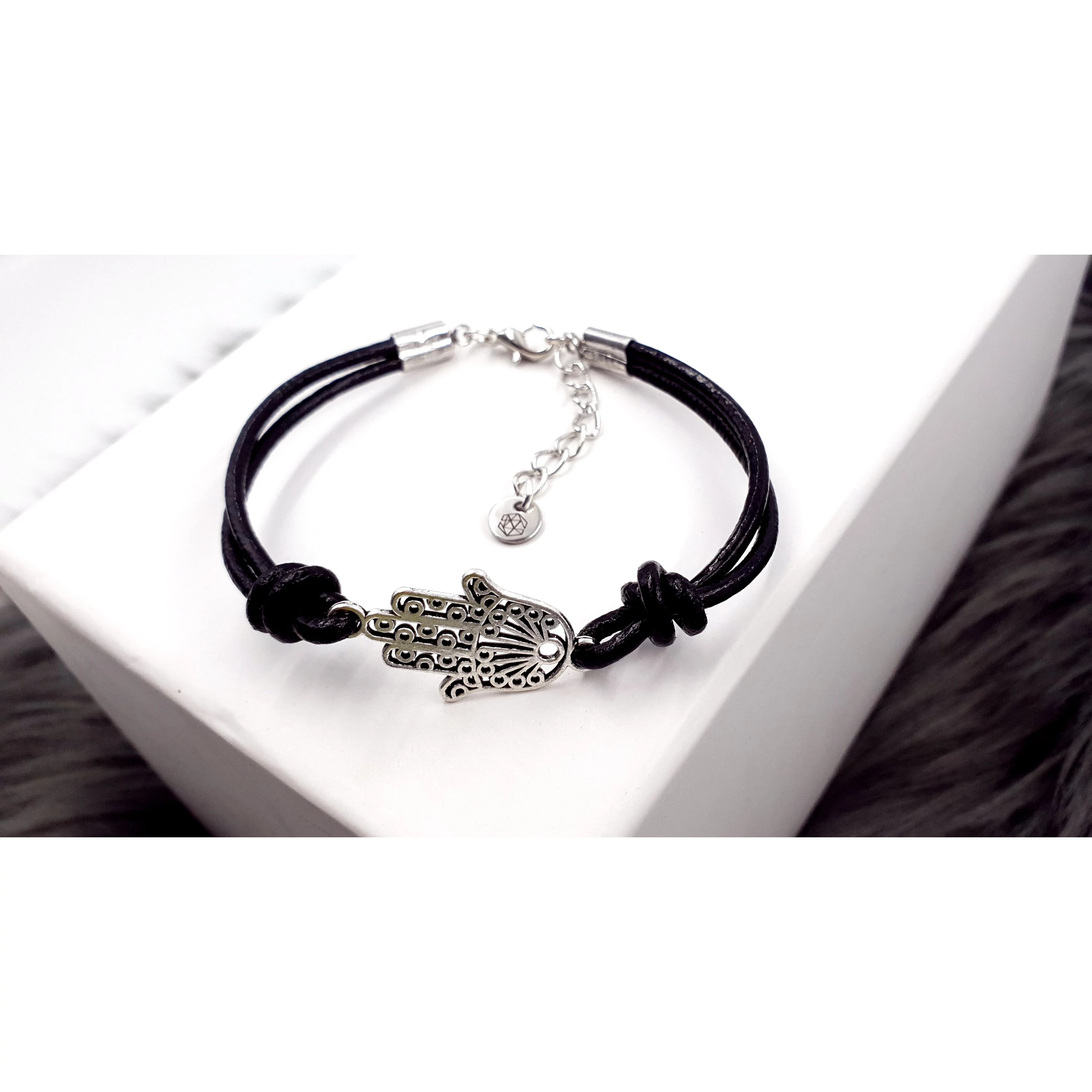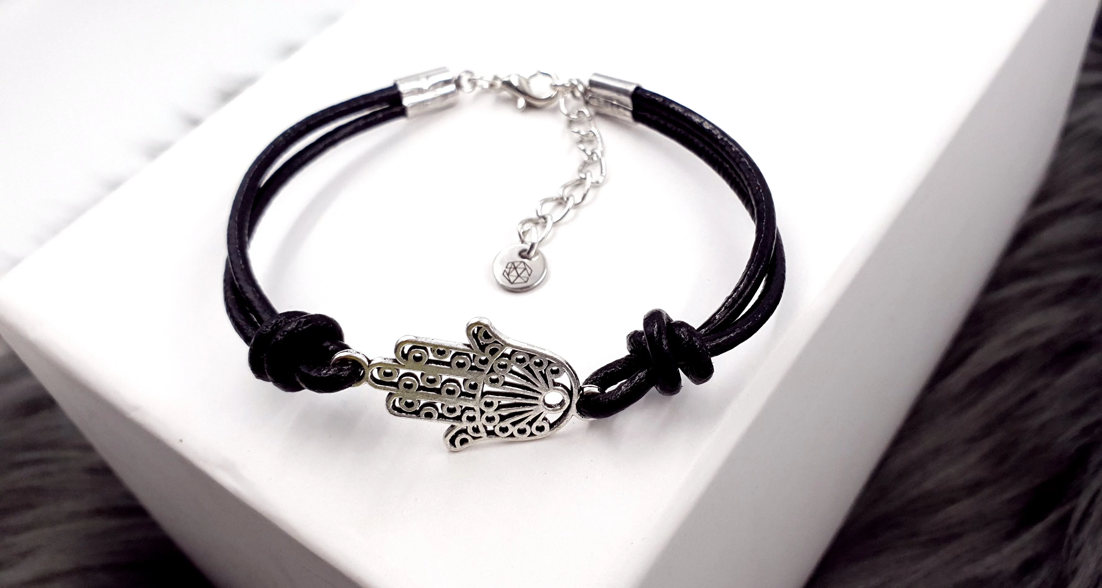 Ez az egyedi Yvonne Design karkötő, fonott bőrből készült, kapcsos záródással, és lánchosszabbítóval, illetve egy hamzskéz medállal. Ez a karkötő unisex stílusú, ezért nők és férfiak számára is egyaránt ajánljuk!