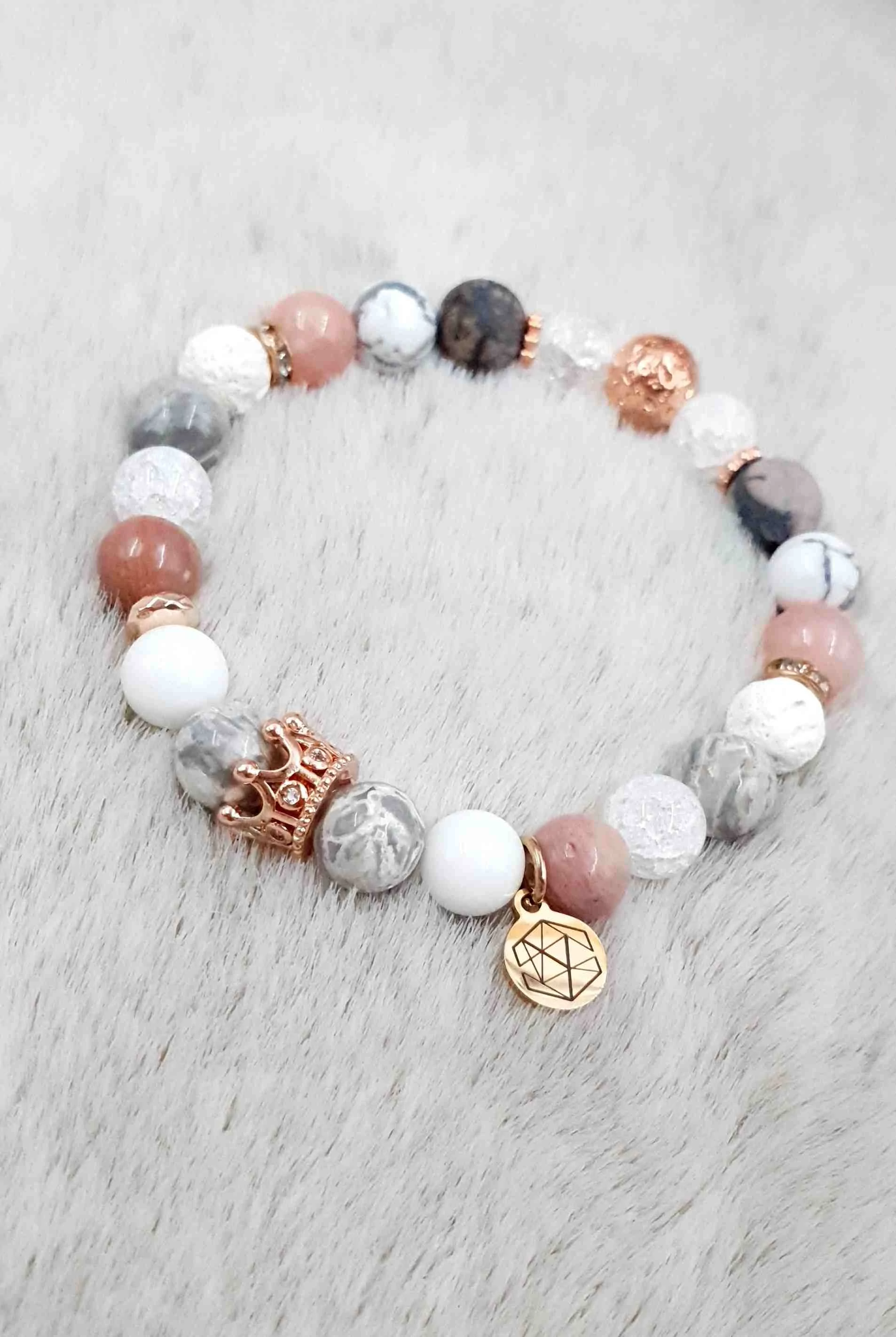 Gyönyörű egyedi Yvonne Design  LUXURY  ásványkarkötő, mely zebrajáspis, rózsakvarc, howlit ásványokből készült és rosegold szín díszítést tartalmaz, illetve egy 10 mm-es  cirkon medált.