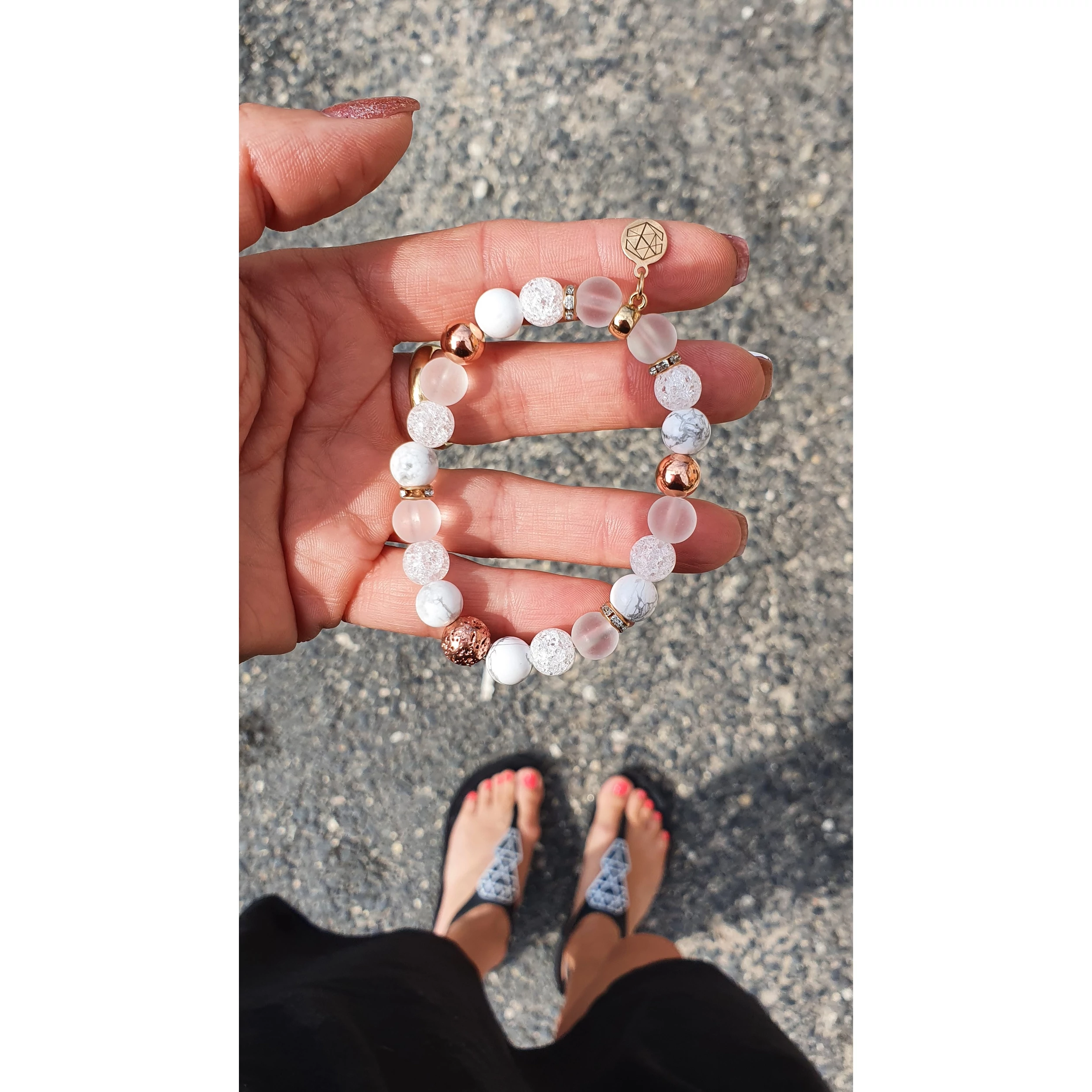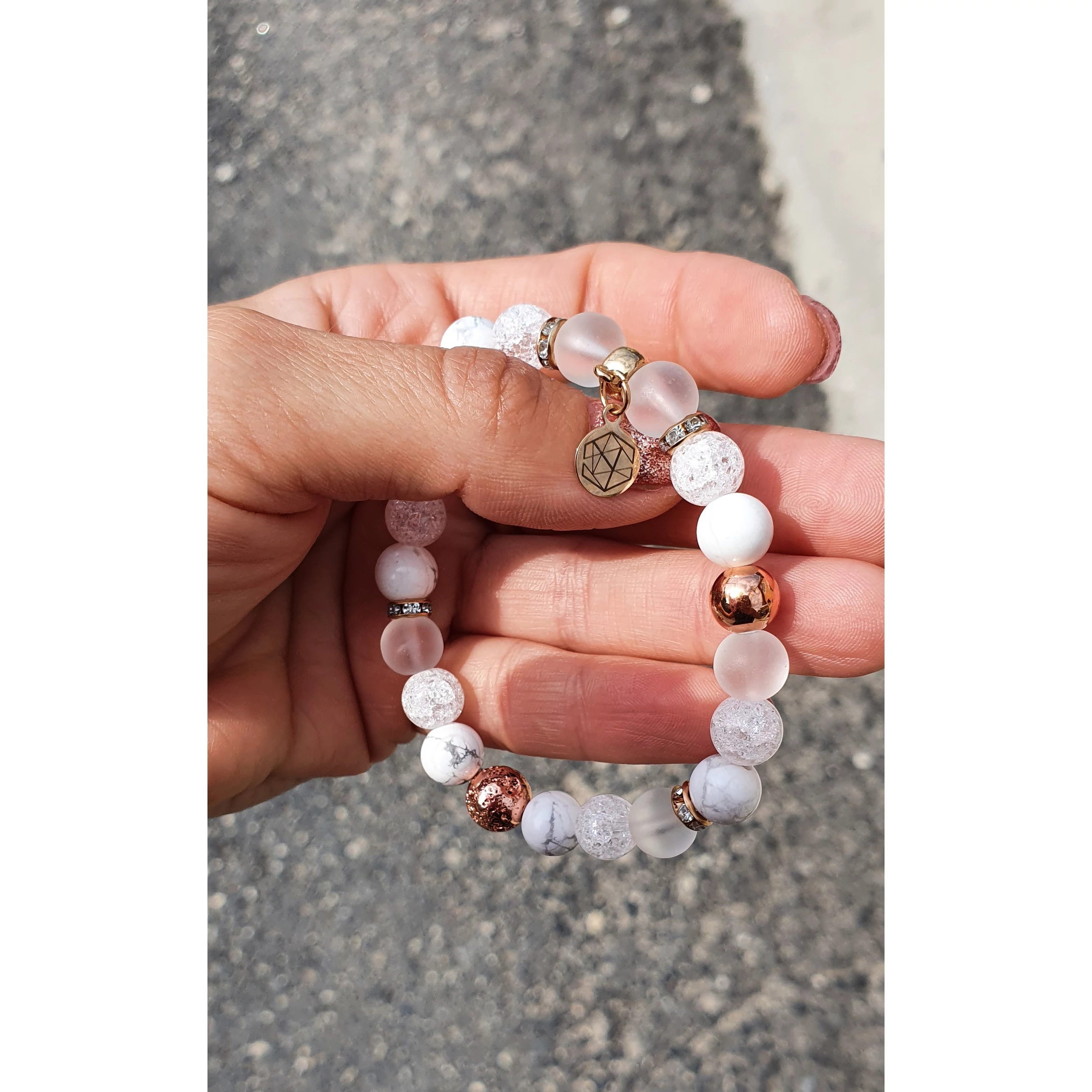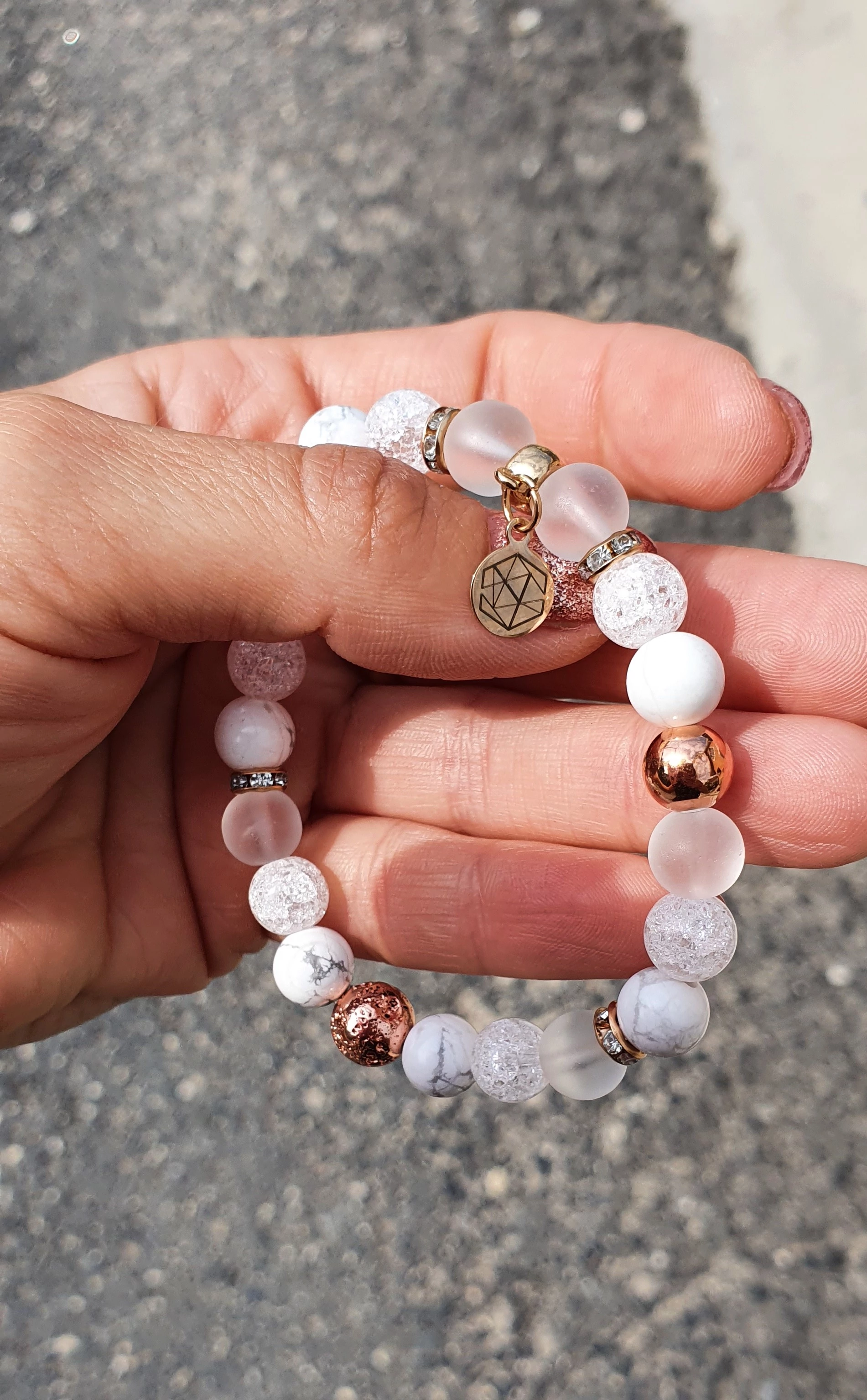 Gyönyörű  Yvonne Design "rosegold" ásványkarkötő hegyikristály, howlit, rosegold lávakő ásványokból, rosegold díszítéssel.
