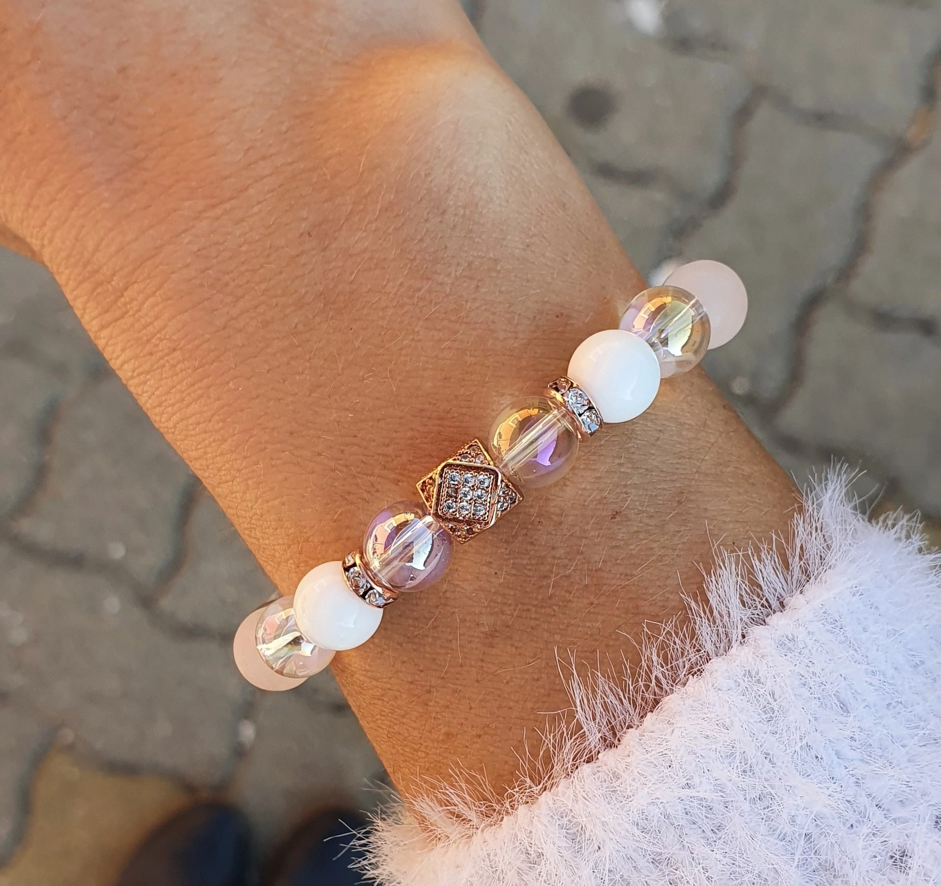 Yvonne Design rosegold luxury ásványkarkötő. Gyönyörű csillogó prémium minőségű pasztell ásványkarkötő, mely rose zebrajáspis, tenyésztett igazgyöngy, hegyikristály, tejkvarc és aurakvarc ásványokból készült, luxury rosegold díszítéssel.