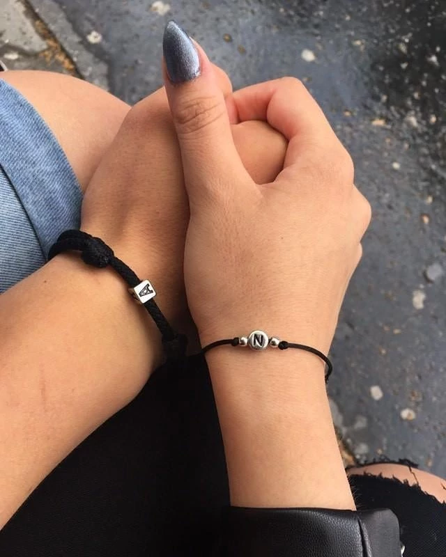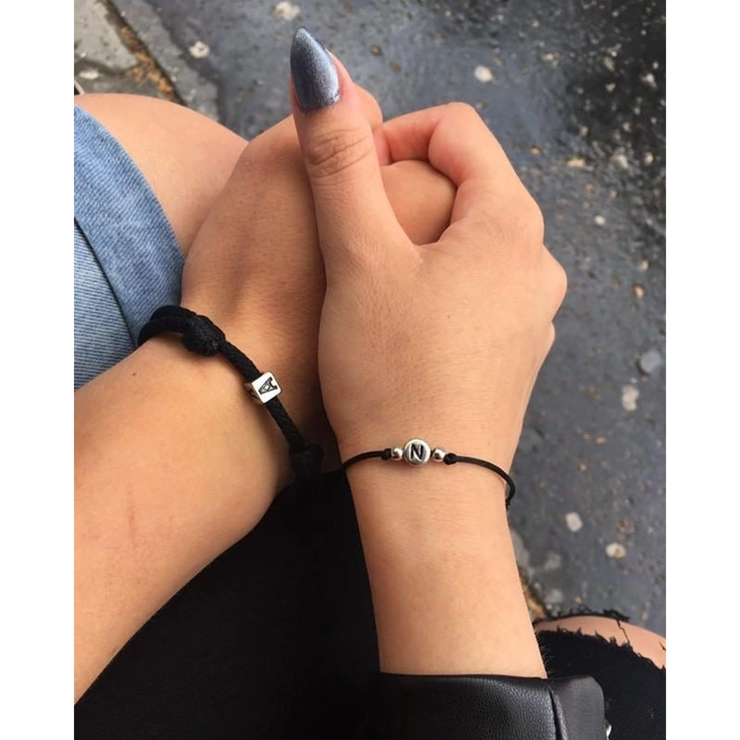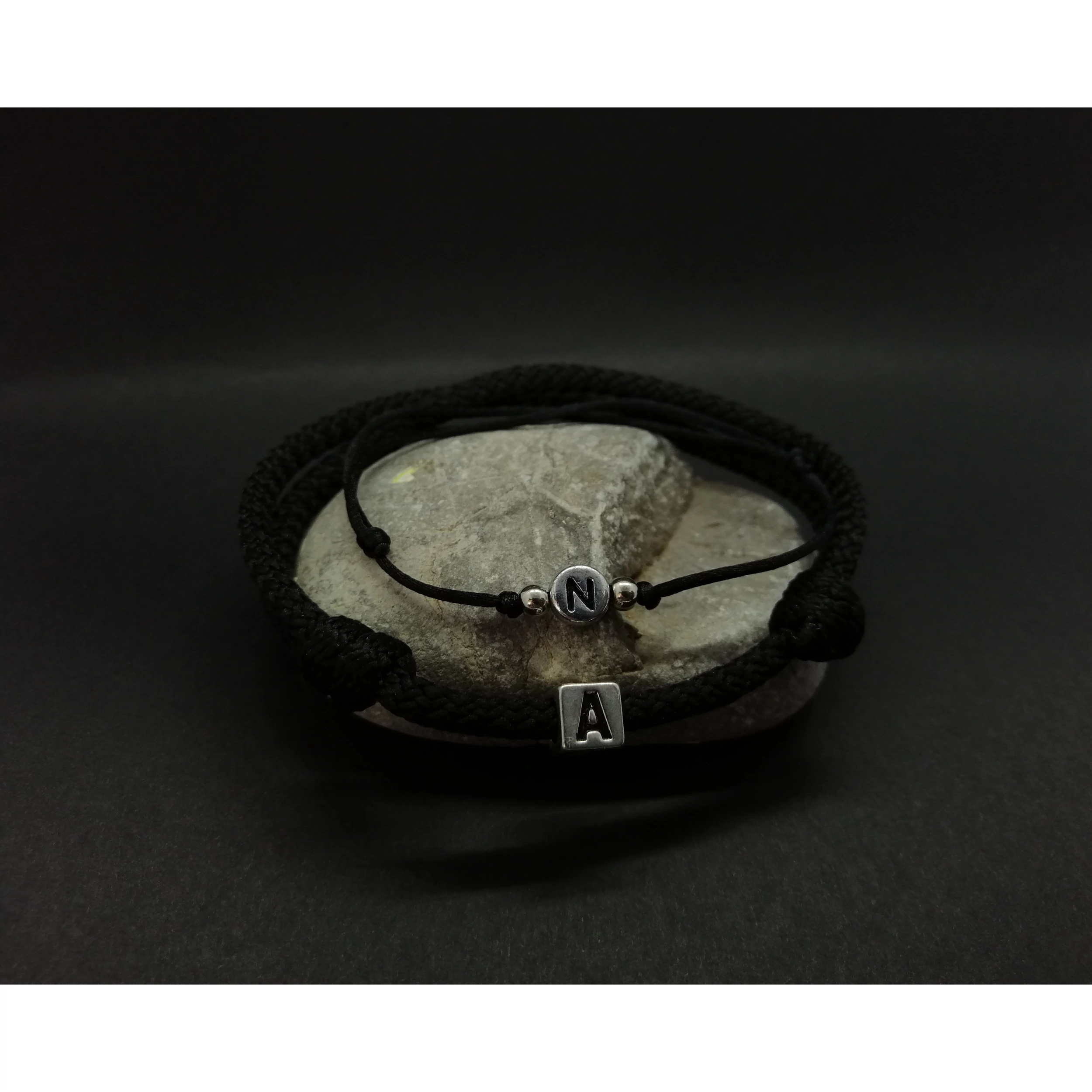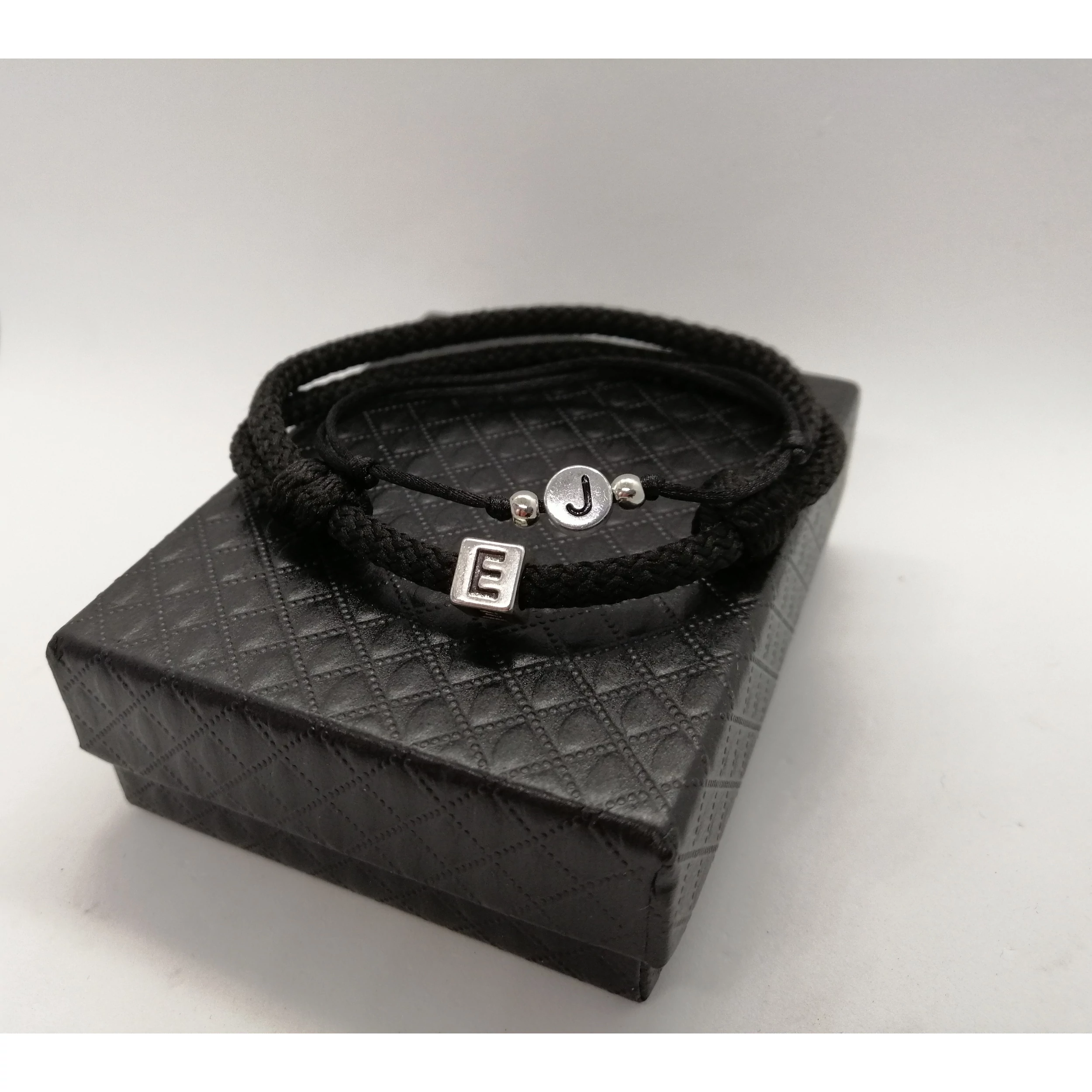 Ez az egyedi karkötő pár, fekete parakord zsinórból készült, csomózásos makramé technikával. A betűk - melyeket egyedileg adhatsz meg- ezüst színűek. A karkötő méretre készül és pontos precíz eldolgozásokkal, gyönyörű, hibátlan tökéletes darabot fogsz kézhez kapni! A betűket egyedileg rendelheted hozzájuk, így személyre szabottan egyedi karkötőpár készül részetekre.